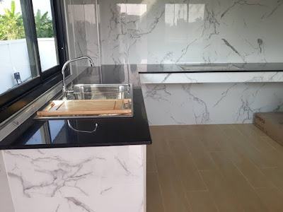 ในส่วนของห้องครัวจะเห็นว่ามีการออกแบบได้แตกต่างจากห้องอื่น โดยเลือกใช้กระเบื้องที่มีลวดลายเป็นรูปสี่เหลี่ยมข้าวหลามตัดแบบเรียงห่างกัน ส่วนพื้นห้องครัวมีการเลือกใช้เป็นกระเบื้องสีครีมขัดเงา ที่เข้ากับบานประตูเคาน์เตอร์