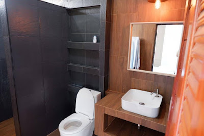 ห้องน้ำของบ้านหลังนี้ที่มุ่งเน้นใช้ผนังในโทนสีขาว แล้วเพิ่มเติมรายละเอียดด้วยกระเบื้องที่เรียงกันเป็นลวดลาย ซึ่งพอดูไปแล้วเข้าชุดกับสุขภัณฑ์ภายในห้องน้ำ อีกทั้งยังมีอ่างล้างหน้าแบบลอยตัวช่วยให้ห้องดูโดดเด่นมากขึ้น