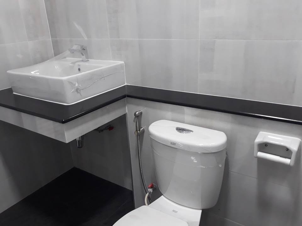 ห้องน้ำของบ้านหลังนี้ที่มุ่งเน้นใช้ผนังในโทนสีขาว แล้วเพิ่มเติมรายละเอียดด้วยกระเบื้องที่เรียงกันเป็นลวดลาย ซึ่งพอดูไปแล้วเข้าชุดกับสุขภัณฑ์ภายในห้องน้ำ อีกทั้งยังมีอ่างล้างหน้าแบบลอยตัวช่วยให้ห้องดูโดดเด่นมากขึ้น