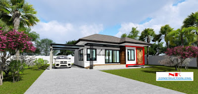 แบบบ้านตัวแอล ชั้นเดียวสไตล์โมเดิร์น หลังคาปีกนก