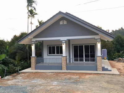 สร้างบ้านชั้นเดียว สไตล์ชนบท ทรงหน้าแคบ โทนสีเทาอมฟ้า