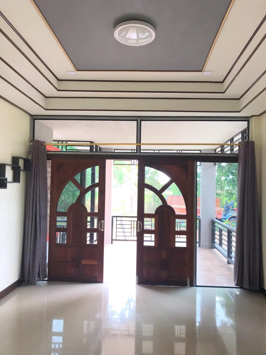 รอบตัวบ้านเองก็ถูกติดตั้งด้วยประตูและหน้าต่างกระจกใสรูปทรงสูง จึงได้ช่วยให้บ้านสว่าง และโปร่งสบาย นอกจากนี้แล้วด้านนอกตัวบ้านก็ยังออกแบบให้เป็นเฉลียงสำหรับการพักผ่อนที่โปร่งสบายอีกด้วย