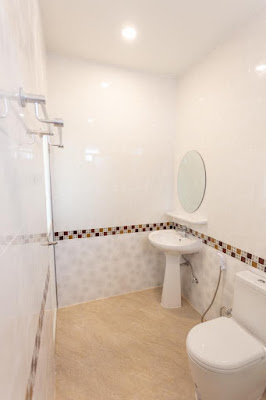 การออกแบบห้องน้ำให้ดูเรียบง่าย มุ่งเน้นเป็นโทนสี 2 สีตัดเข้ากัน คือ ขาวกับดำ โดยพื้นห้องน้ำจะใช้เป็นกระเบื้องขัดเงาลูกลายหิน ซึ่งให้ความรู้สึกแบบธรรมชาติ ซึ่งเข้าชุดกันกับสุขภัณฑ์ภายในห้องน้ำได้เป็นอย่างดี